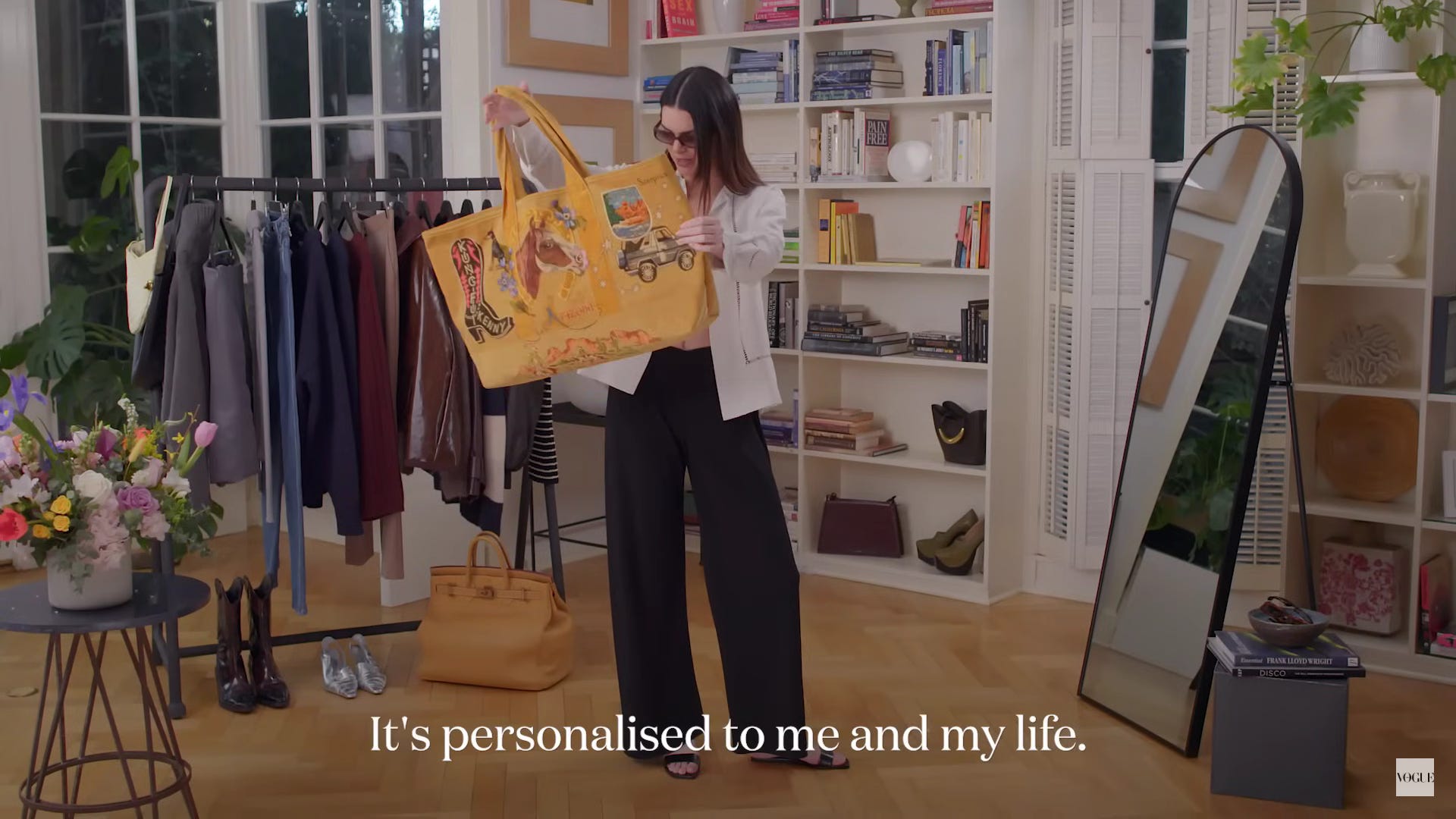 which was chock full of great maternity style inspiration. (Also, did we all see that announced she was pregnant? Where was her YouTube Video about first trimester fashion 8 years ago?!) I did a deep dive on Janelle’s page and found this very fabulous photo of her with colored socks under fisherman sandals which I immediately recreated.I have long been obsessed with the personalized Bode tote that Kendall Jenner showed off in her 7 Days, 7 Looks for Vogue India.