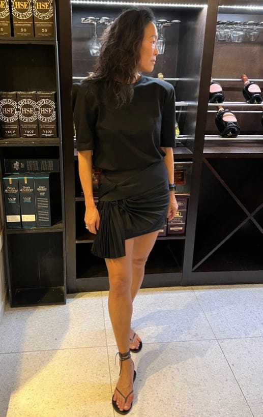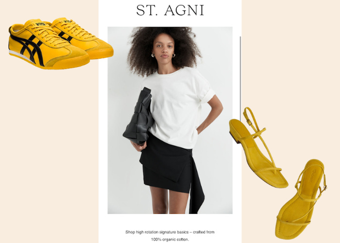 I saw this outfit in a marketing email for St. Agni the other day and I’m smitten with the causal white tee (this feels like a less expensive alternative) combined with the elevated mini skirt and tote. I’d pair this look with a “pop of color” shoe. Did I immediately set a second hand search for St. Agni? Duh.