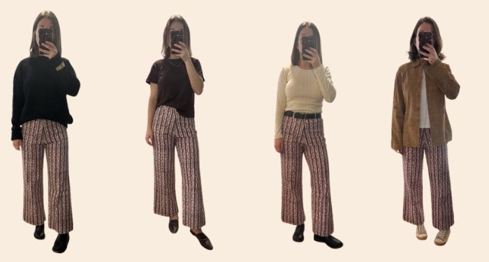 I’ve found that by rewearing a new piece multiple times right after getting it sets a mental reminder to myself that it’s a good addition to my wardrobe. I really wanted a pair of- what I call- Hero Pants for months (I first wrote about it here in 2023!). I finally purchased and, frankly, I can’t stop wearing them.