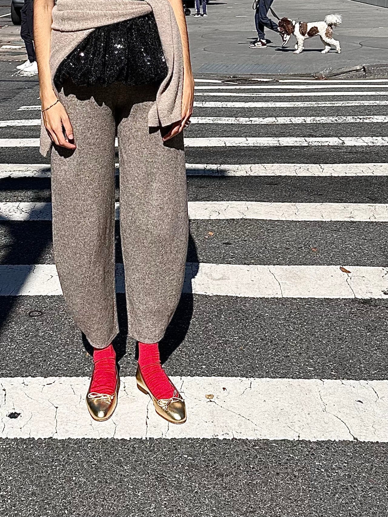The first photo is clearly Leandra Medine Cohen who- I believe- is one of the truest trend setters of our time. Not only is her reach extensive but her ideas on clothing are unique and eventually reach the masses. She eschewed the virtues of a mesh flat before everyone else. It took over a year but her post on red socks with ballet flats has now shown up on two influencers in a matter of weeks in my echo chamber.