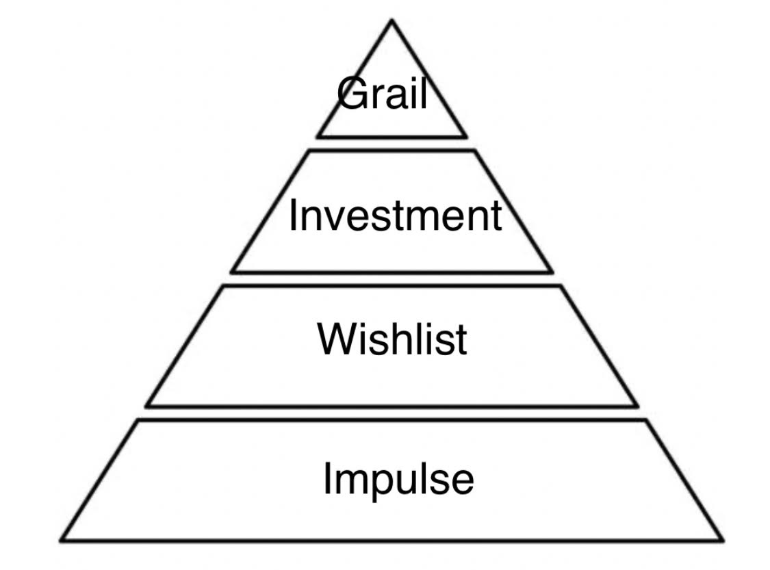 Essentially, the shopping hierarchy pyramid consists of a base where we spend most of our money are “impulse” purchases. According to OldLoserInBrooklyn, Impulse purchases include things you didn’t spend much time thinking about before purchasing (imagine a hair clip you grab at Target). “Wishlist” items are things you actually add to a wishlist on a website (think “obsessions” on The Real Real). Wishlist pieces are things you might wait to buy until they go on sale or save for a little. “Investment” pieces are the items that require much more saving for or a celebratory item (think a birthday purse). Lastly we have “Grail” items which OldLoserInBrooklyn equates to Wedding Dress shopping.
