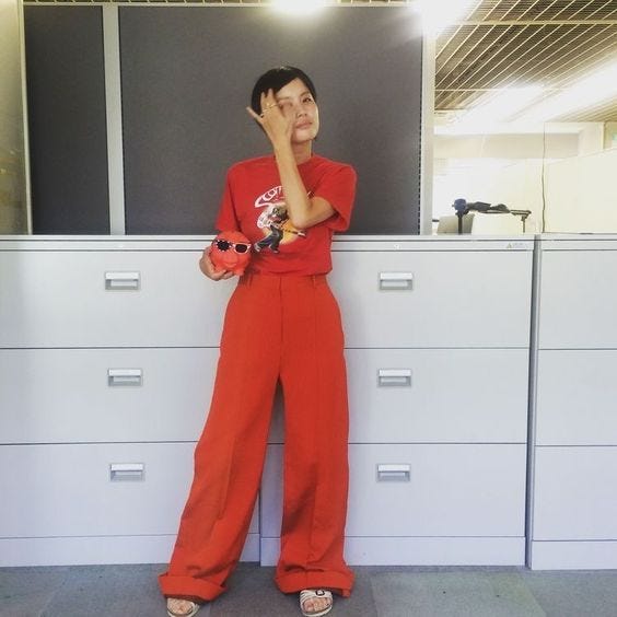 If your brain immediately went here and you are writing off this idea because you don’t own cherry red pants and top, my I present some more (attainable) suggestions;